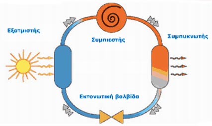 Το ψυκτικό μέσο ρέει πάλι προς τον εξατμιστή και η διεργασία επαναλαμβάνεται