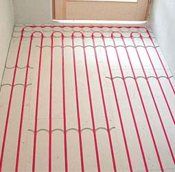 Διάστρωση των σωλήνων Profitherm σε μονωτικές πλάκες και στήριξή τους σ’ αυτές με ειδικά άγκιστρα. Οι ειδικές θερμοηχομονωτικές πλάκες που εξασφαλίζουν τη ζητούμενη θερμική και ηχητική μόνωση είναι από διογκωμένη πολυστερίνη, ενώ η πάνω επιφάνειά τους καλύπτεται από μια πολλαπλά ενισχυμένη αυτοσβηνούμενη μεμβράνη που λειτουργεί ως φράγμα υγρασίας. Η δε διάστρωση των σωλήνων Profitherm γίνεται με το μηχάνημα Ergon Tacker, το οποίο τους στηρίζει στις πλάκες με ειδικά άγκιστρα. |